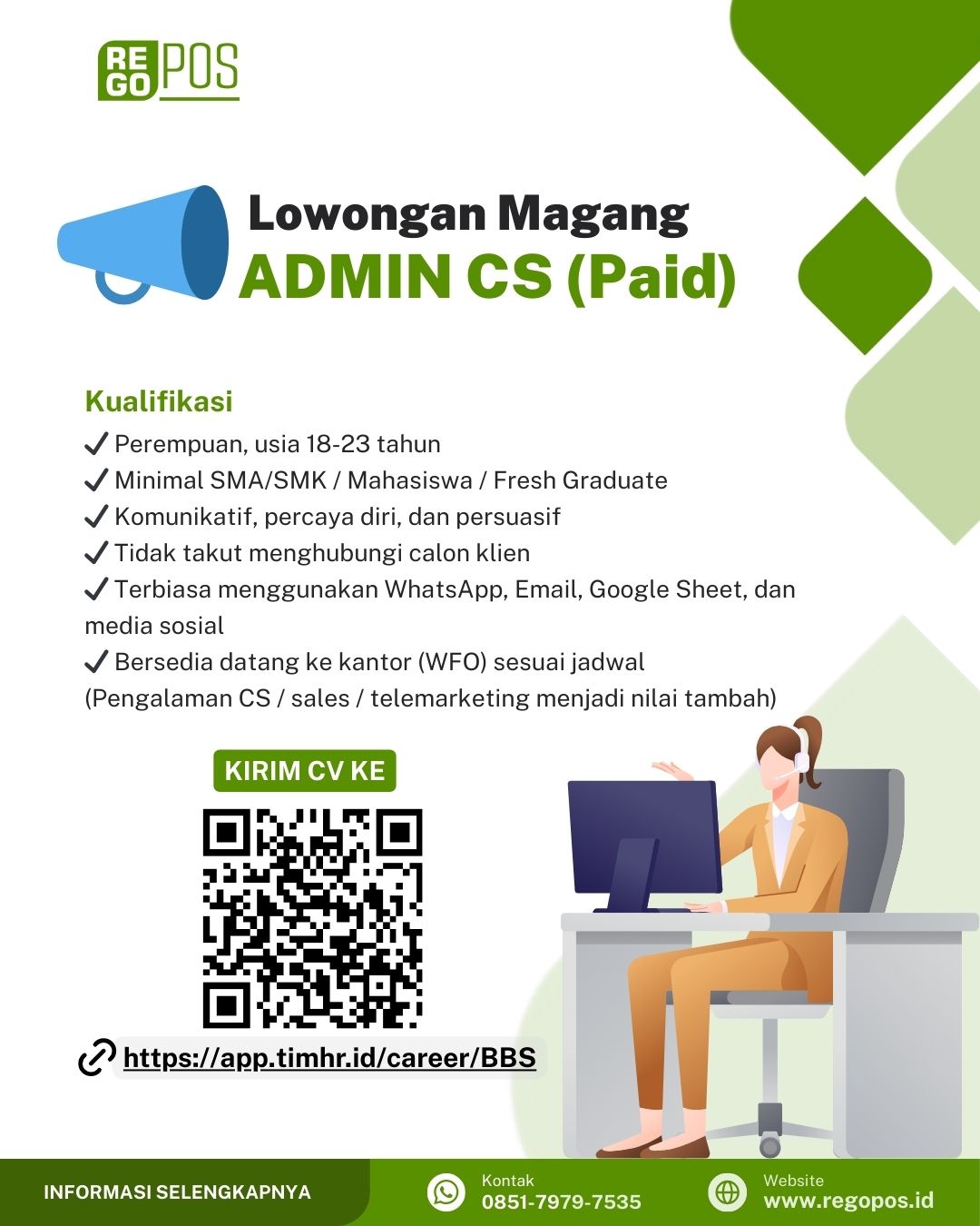 Kami membuka kesempatan MAGANG (INTERNSHIP) untuk posisi Admin Customer Service / Marketing Online, bagi kamu yang ingin belajar langsung di lingkungan kantor tentang customer handling, lead generation, dan proses penjualan online.